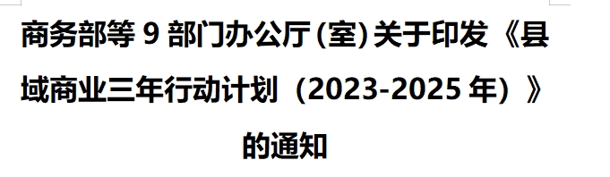 为全面贯彻落实党的二十大和中央农村工作会议精神,落实《中共中央 国务院关于做好2023年全面推进乡村振兴重点工作的意见》(中发〔2023〕1号)有关部署,充分发挥乡村作为消费市场和要素市场的重要作用,进一步提升县域商业体系建设成效,促进城乡融合发展,助力乡村振兴,商务部等9部门研究制定了《县域商业三年行动计划(2023-2025年)》。
